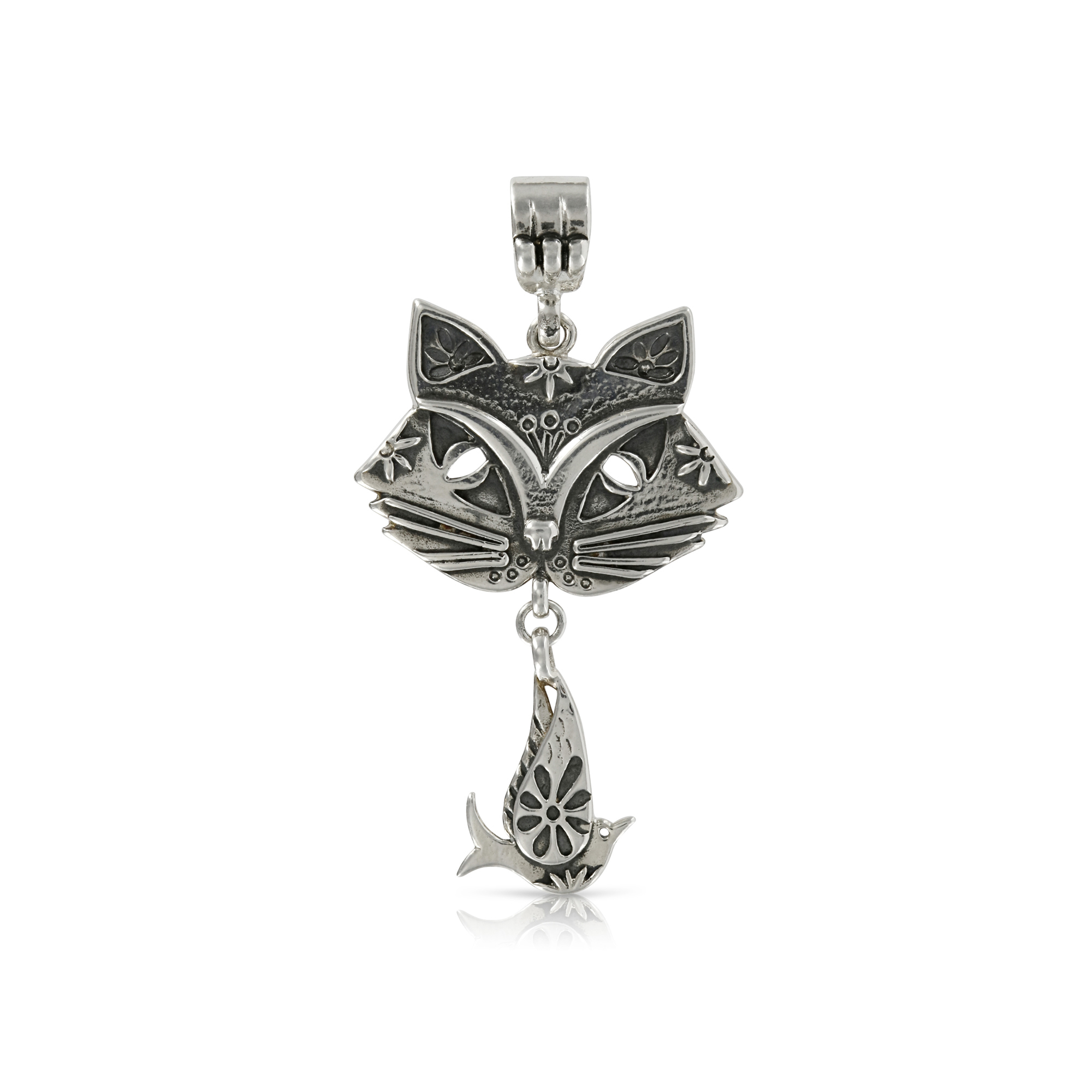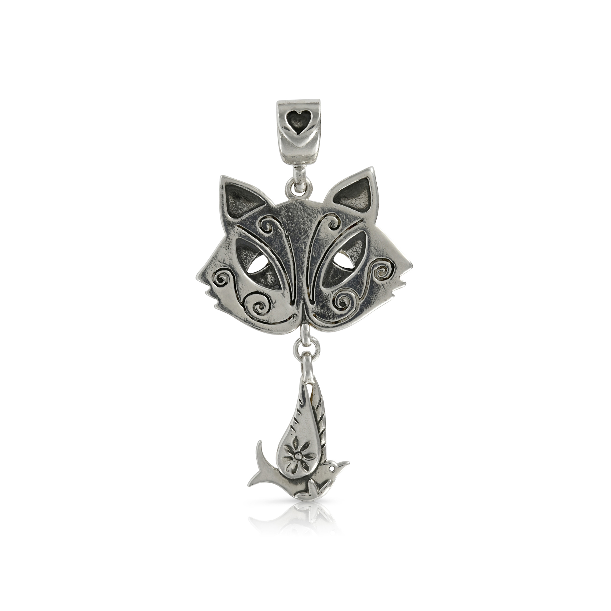 Silver Cat with Bird Pendant £155.00 This beautiful but wicked little cat has our precious bird in his sights. Stylised and ornate with claw detail bale, this pendant can be worn long or short. Approximately 5.5cm including bale. Please order chain separately. Silver Cat with Bird Pendant quantity Add to basket SKU: P008P Category: Pendants Tags: bird, cat