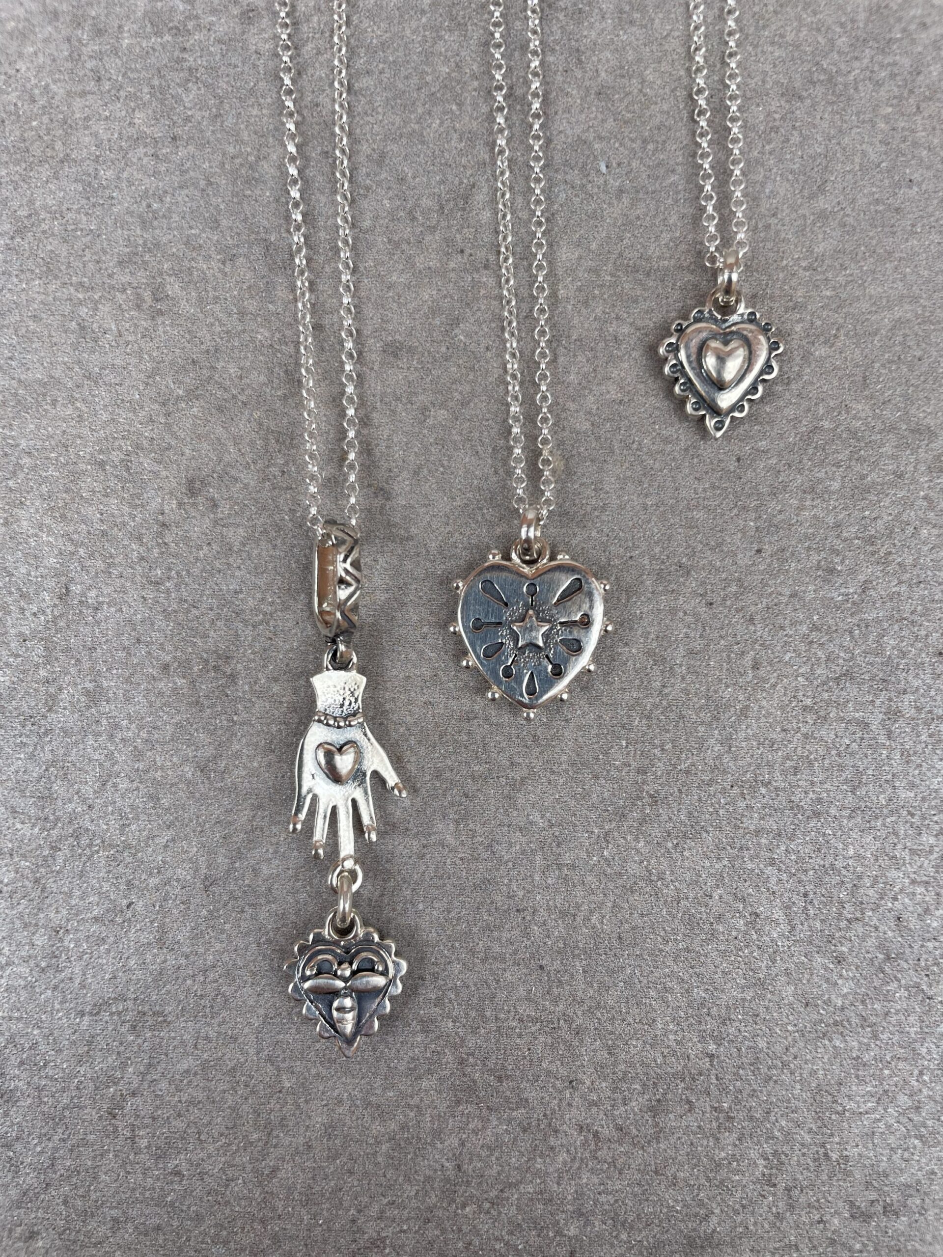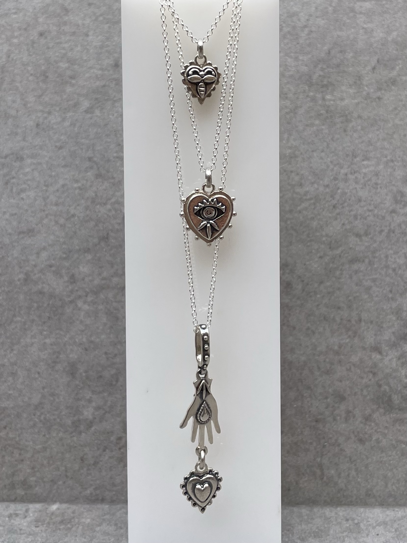 Beautiful heavy little solid silver heart pendant, has an eye on one side and a little starburst on the other, finished with a frame of tiny silver balls and hanging on a silver mini belcher chain.