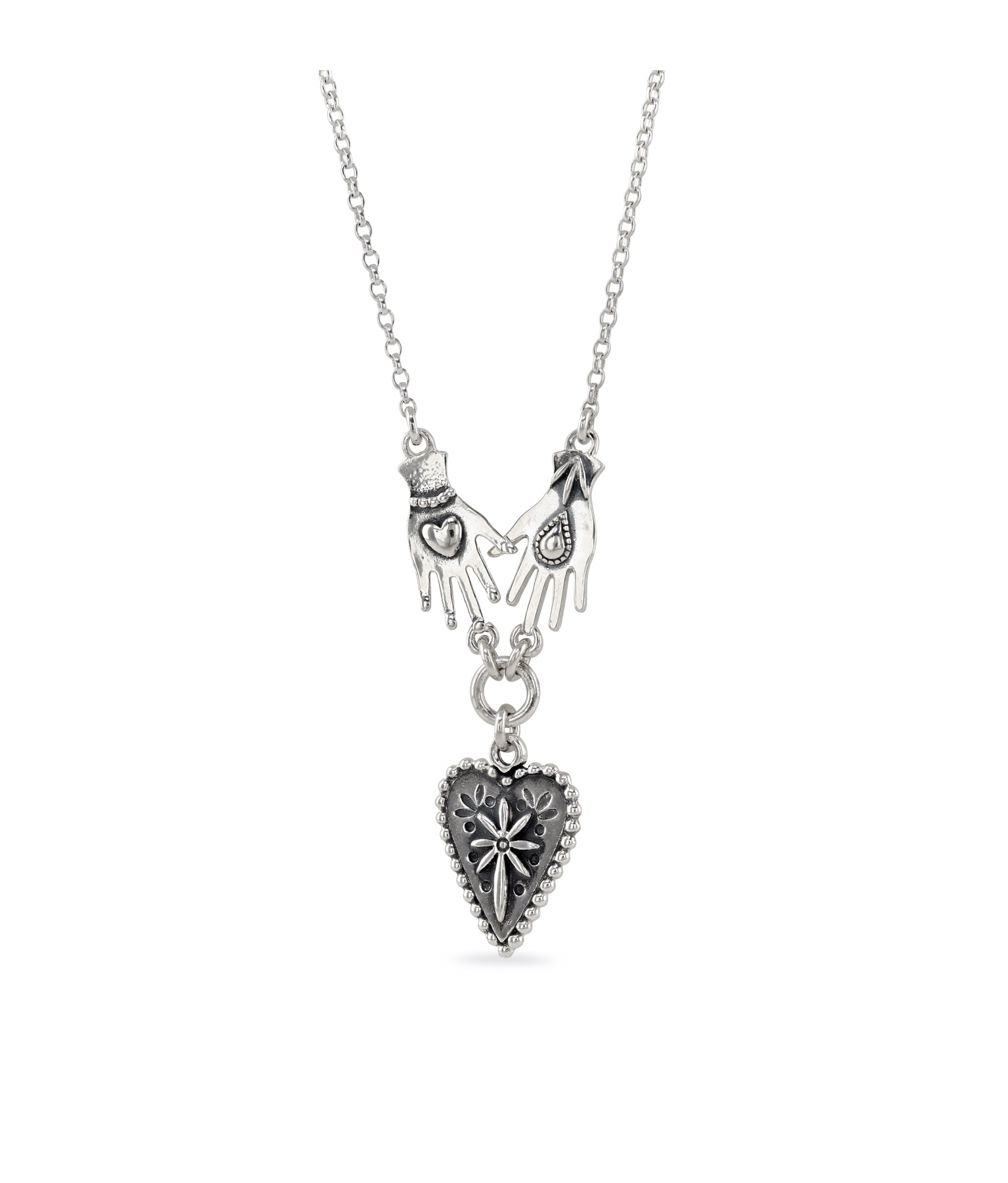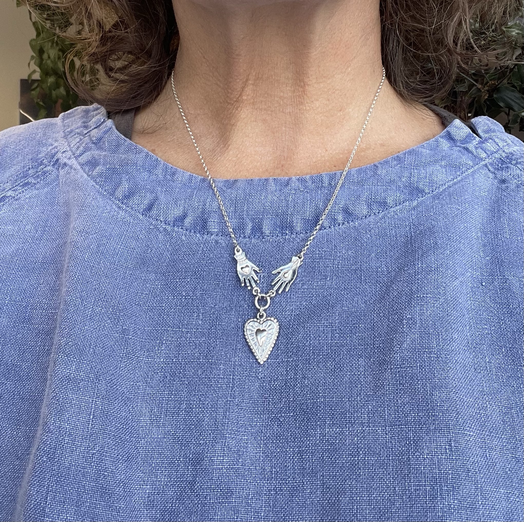 Two tiny hands holding a sacred heart drop on an oval belcher chain. Double sided, 16” overall length.  Bright polished solid sterling silver with a slightly oxidised finish.
