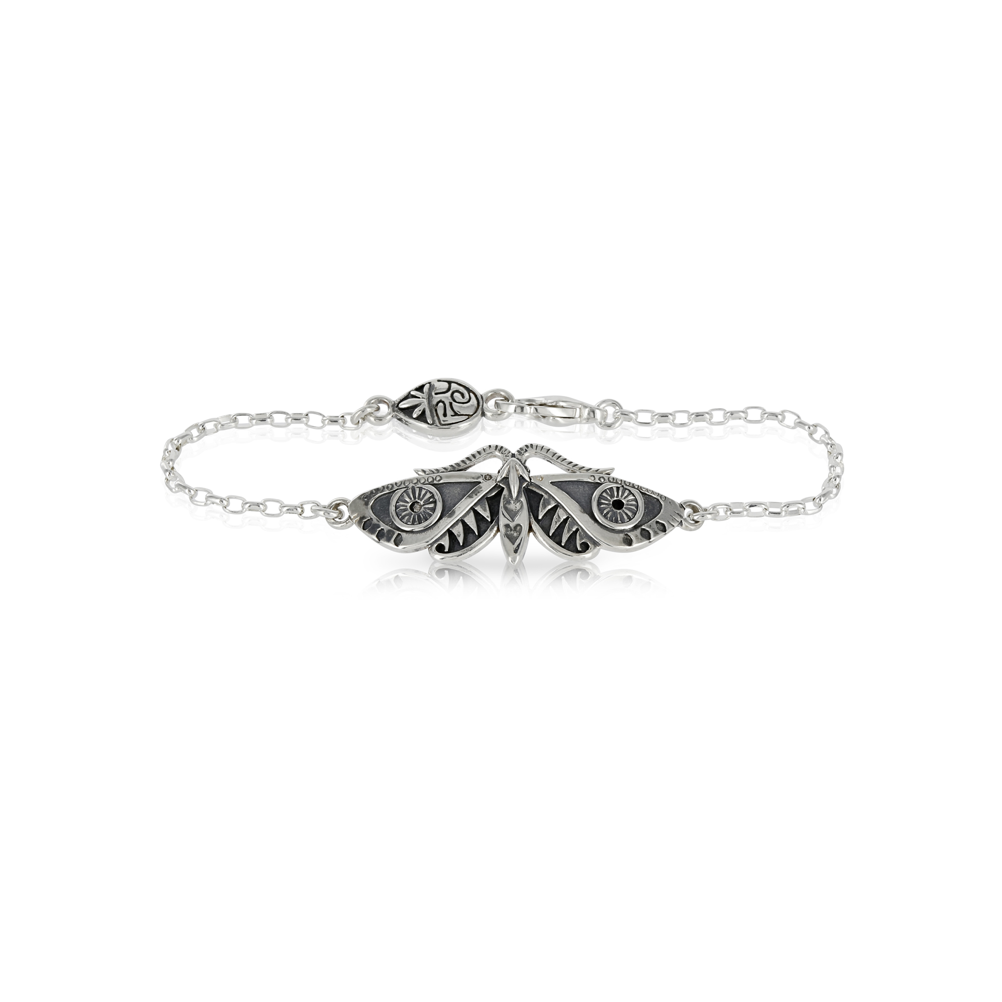 Silver Moth Bracelet £145.00 This beautifully detailed moth curves comfortably around the wrist on a 7″ silver chain. The carabiner catch clips into a beautifully detailed silver Prey bead. Moth approximately 1.5cm x 4cm. Silver Moth Bracelet quantity Add to basket SKU: P013B Category: Bracelets Tags: insect, insect jewellery, Moth You may also like… Silver Moth Necklace £150.00 View Product Silver Moth Ring £105.00 View Product Silver Moth with Feather Pendant £135.00 View Product Silver Moth with Prey Bead and Bug Pendant £160.00 View Product