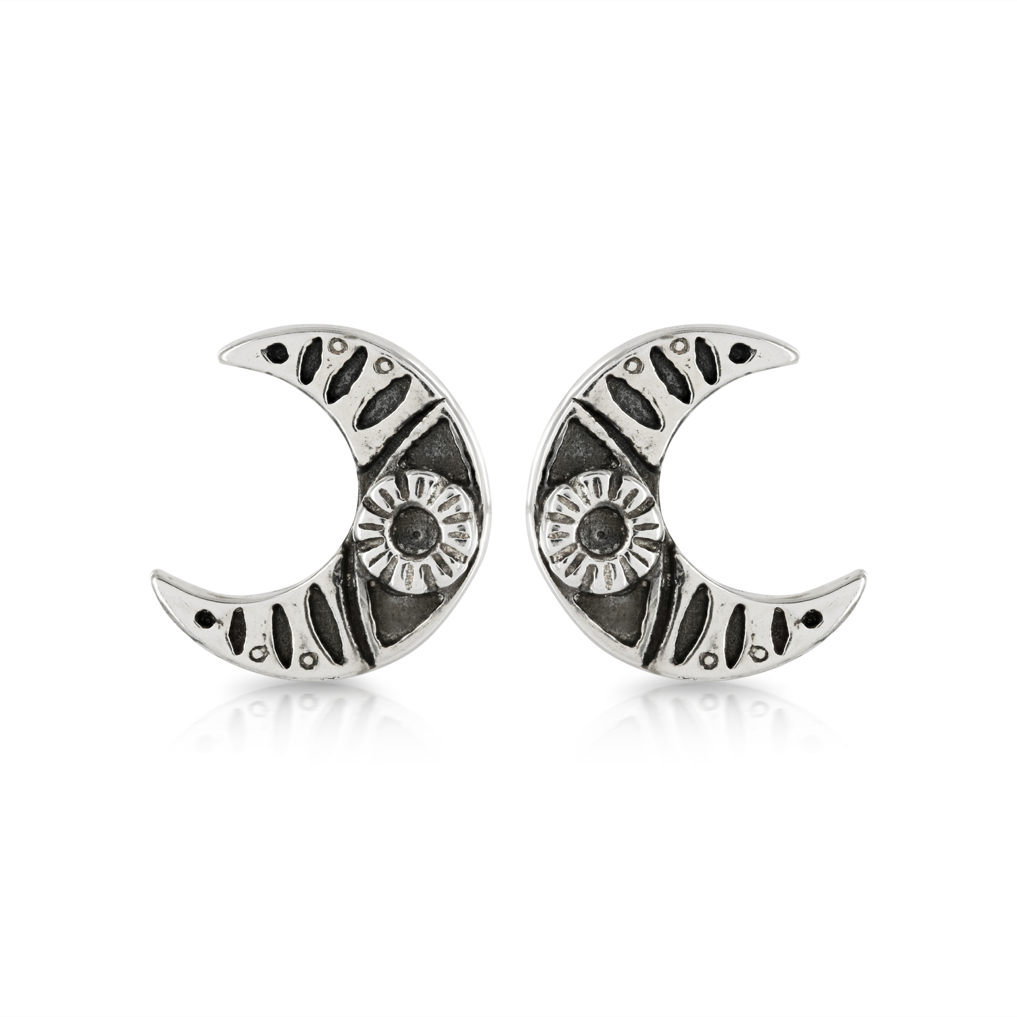 Silver Moon Flower Stud Earrings £55.00 Small ‘eye’ detail moon stud earrings sit beautifully on the lobe. 1.3cm across. Silver Moon Flower Stud Earrings quantity Add to basket SKU: P093E Category: Earrings Tag: Moon
