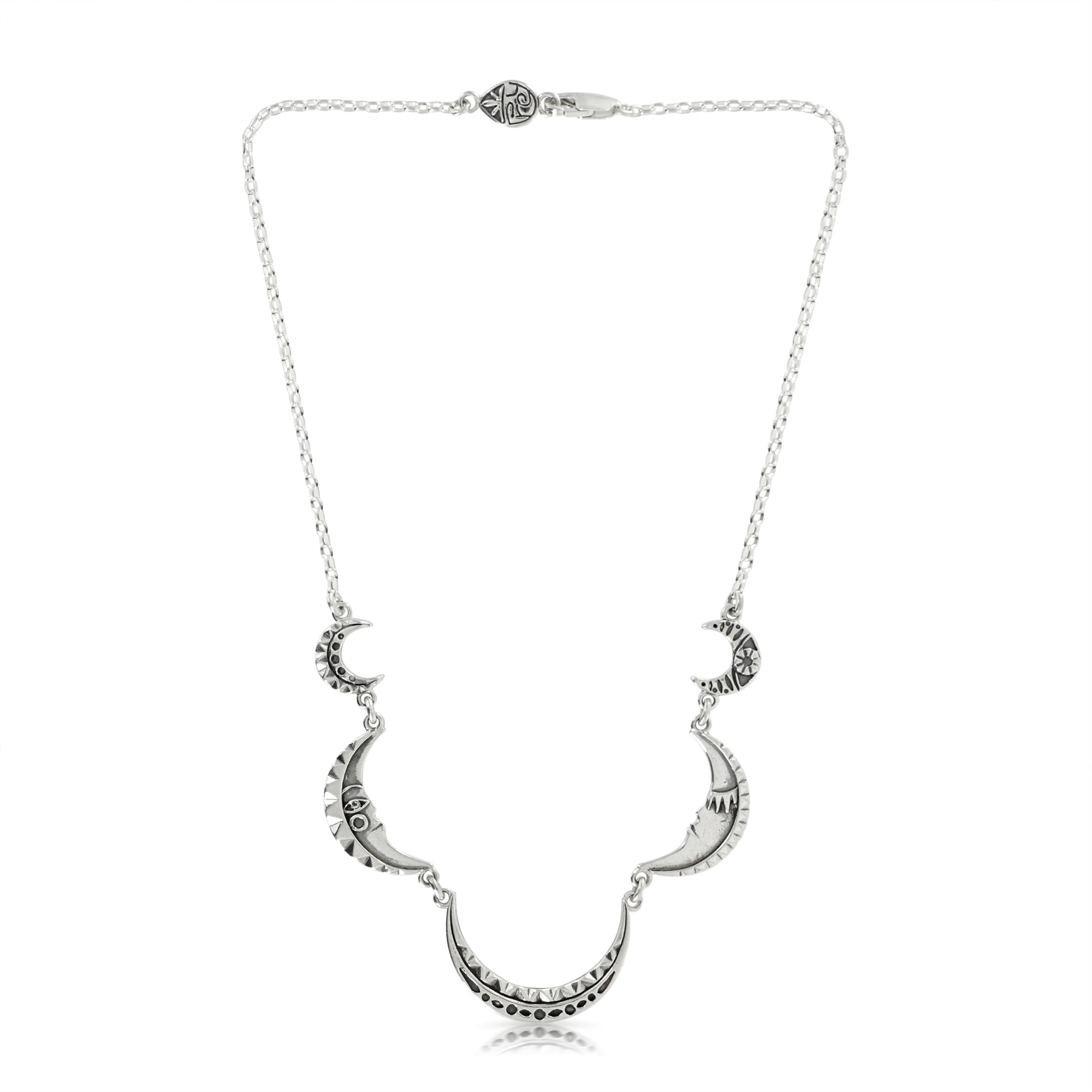 Silver Moons Necklace £225.00 Tiny geometric and ‘eye’ detail moons, our beautiful moon faces and large moon all feature on this stunning necklace with Prey detail fastening. Overall length 41cm. Silver Moons Necklace quantity Add to basket SKU: P112N Category: Necklaces Tag: Moon
