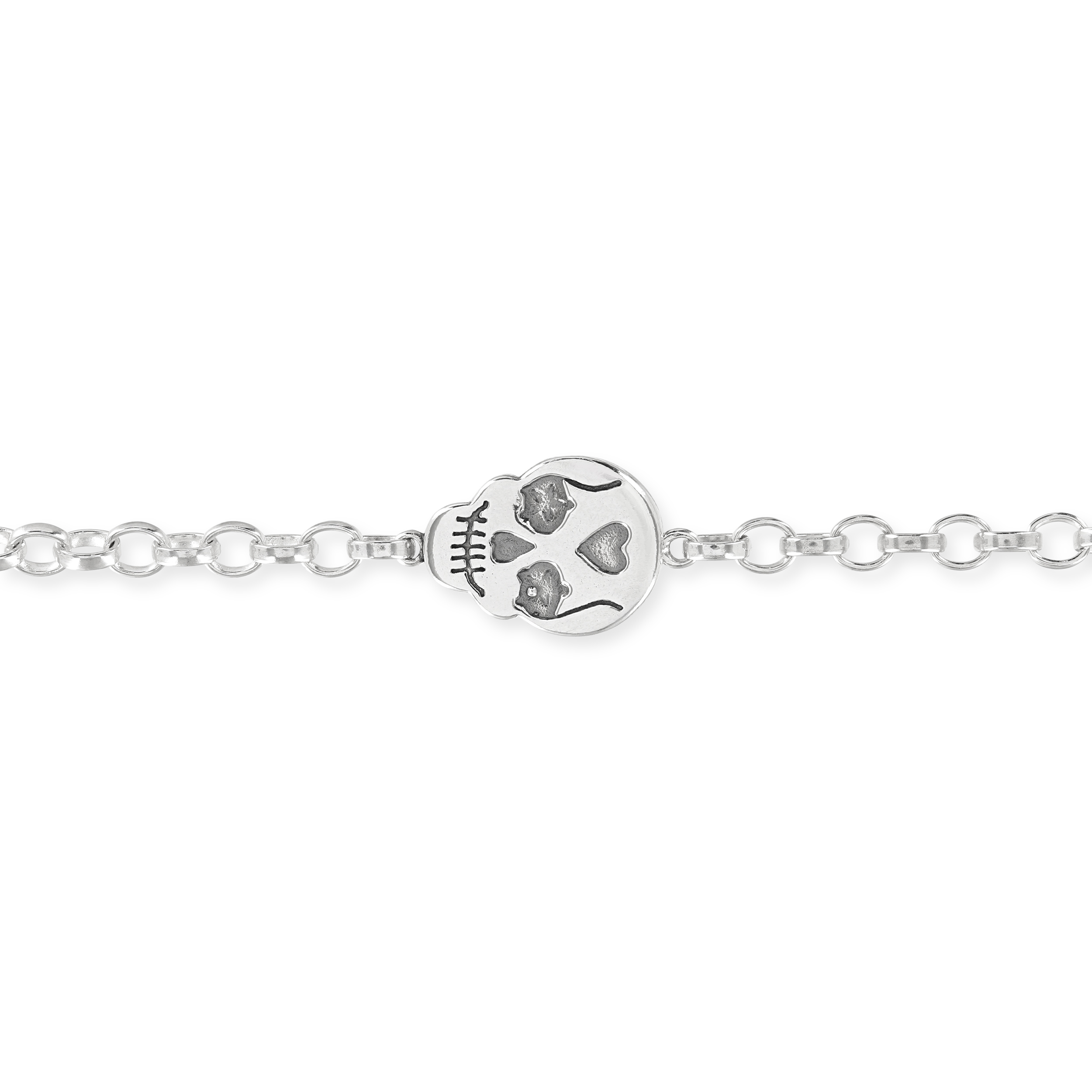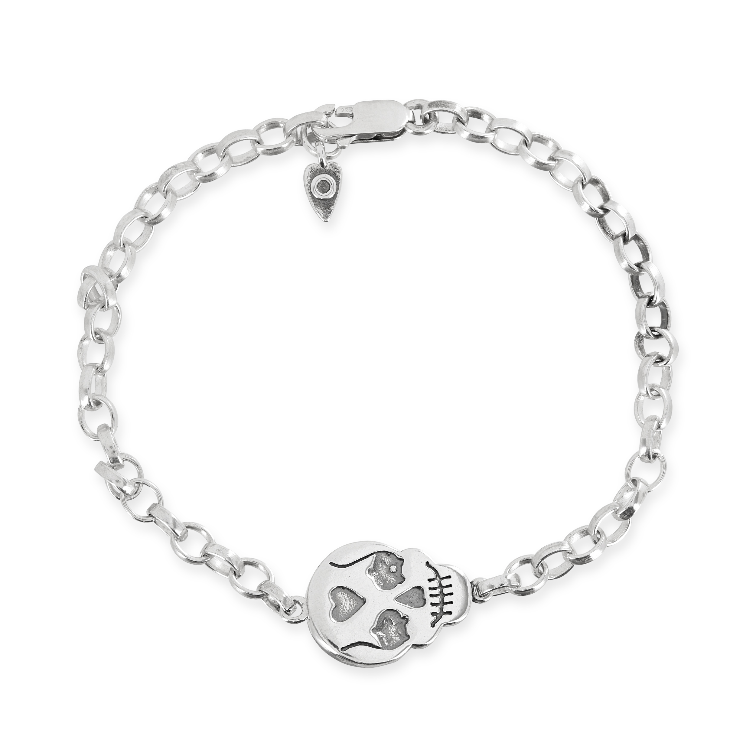 Skull bracelet £120.00 This chunky little skull sits on an oval belcher bracelet and is finished with a tiny heart detail on the end of the chain.Flip her over and she’s a starry eyed sugar skull. Skull bracelet quantity Add to basket SKU: P199B Category: Bracelets Tags: skull bracelet, SUGAR SKULL, sugarskull