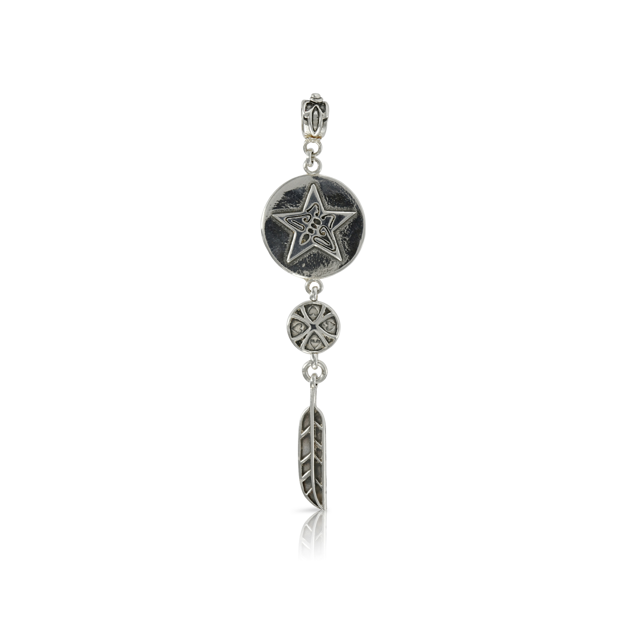 Silver Star with Bead and Feather Pendant £155.00 A beautiful five-pointed chamfered star with lotus flower detail is enhanced by an ornate bead and finished with a feather to make a stunning drop pendant. Approximately 9cm including bale. Please order chain separately. Silver Star with Bead and Feather Pendant quantity Add to basket SKU: P077P Category: Pendants Tags: Feather, Star, totem You may also like… Silver Star Ring £110.00 View Product Silver Star Pendant £90.00 View Product